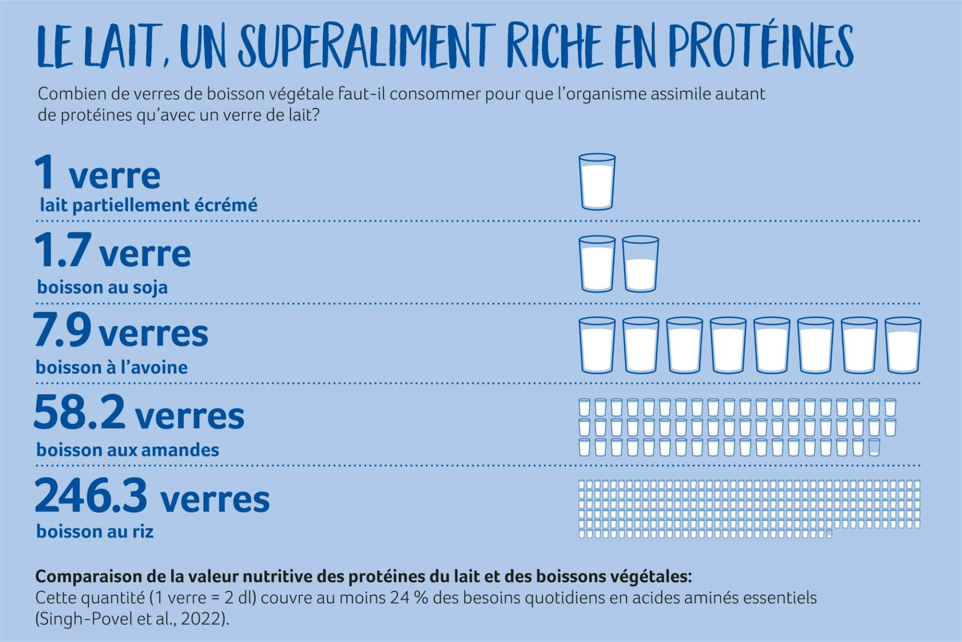 Les boissons végétales peuvent avoir leur place dans la vie quotidienne. Mais en ce qui concerne la densité nutritionnelle et l’assimilation, le lait obtient de bien meilleurs résultats, et ce, sans aucun additif. Si vous privilégiez une alimentation naturelle, le lait est le bon choix!