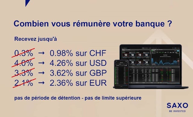 Saxo Bank a une approche très différente, comme l'explique son CEO George Falkner: «Chez Saxo Bank, nous avons pour ambition d'aider nos clients à tirer le meilleur profit de leur argent. C'est pourquoi nous rémunérons leurs avoirs au taux du marché. Actuellement, ils bénéficient d'un taux d'intérêt allant jusqu'à 0,98% pour les avoirs en francs - et même nettement plus pour les avoirs en devises étrangères! Le principe est le suivant: plus vous détenez d'argent sur votre compte auprès de Saxo Bank, plus le taux d'intérêt que vous recevez est élevé - et ce, sans plafond et sans période de blocage pour retirer des fonds».